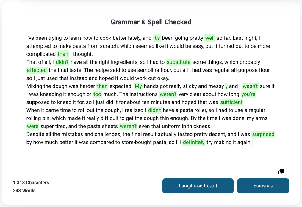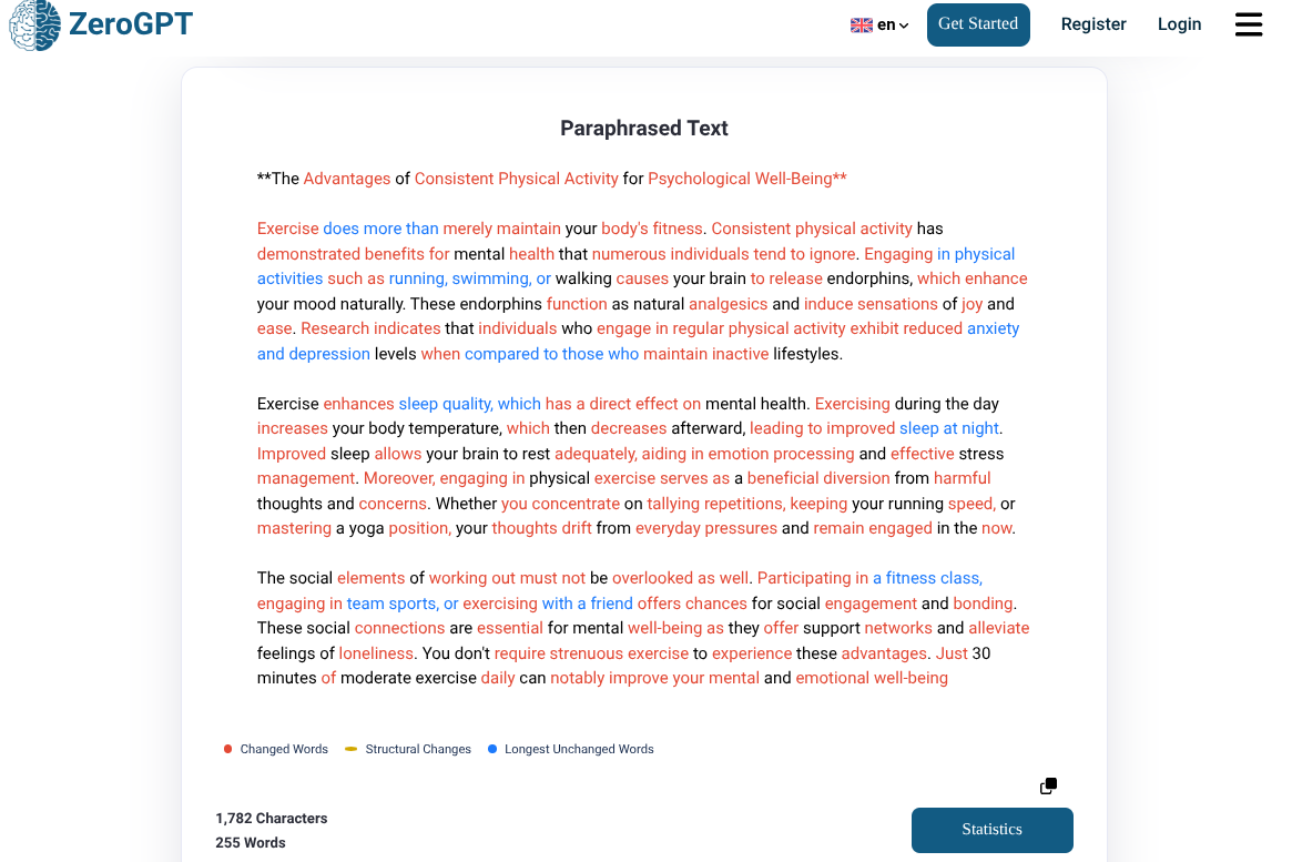 When you hit paraphrase, ZeroGPT simply prints the paraphrased text and highlights the edits.