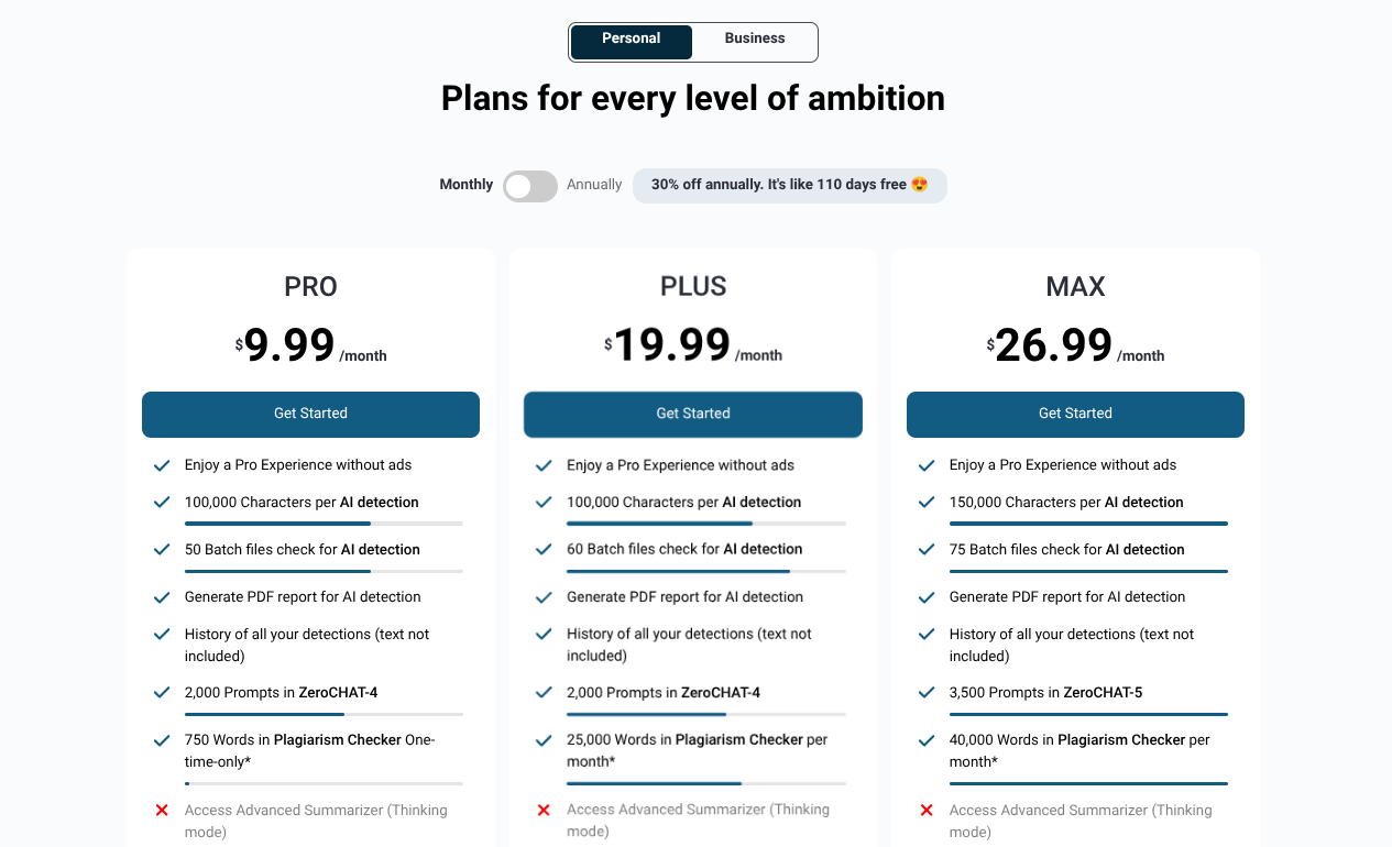 Some ZeroGPT features are not available in these plans either. They only unlock if you buy any of their two business plans, which start from $49.99.