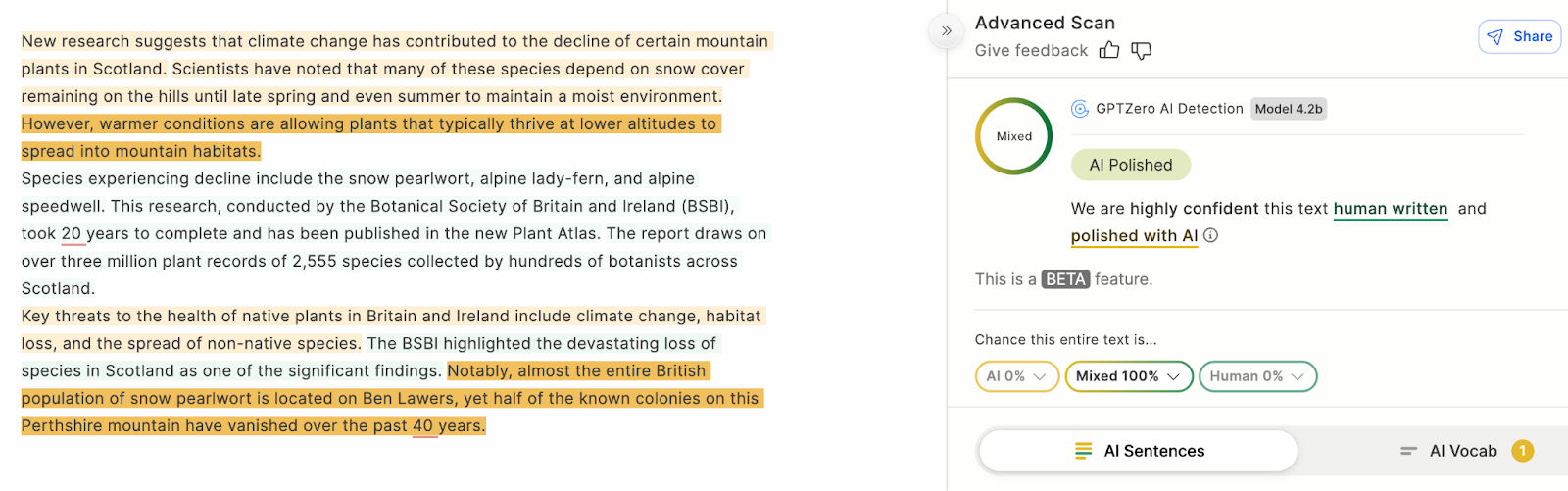 To improve transparency, we’ve decided to distinguish between documents that combine “chunks” of AI and human text and documents rewritten or polished by AI. We now identify these documents under the “Mixed” class with an accompanying tag of “AI Polished”. AI-edited sentences are shown with light green highlighting. In most cases, editing a document with AI changes the majority of sentences. You may see a result like this: